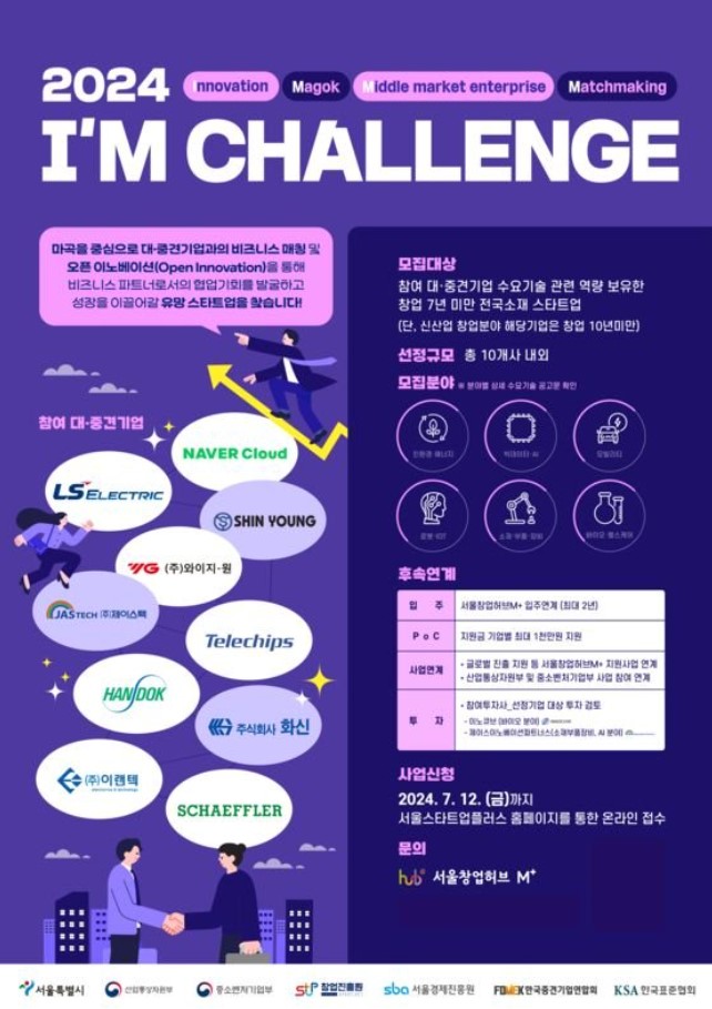 2024³â ¾ÆÀÓ縰Áö(I¡¯M Challenge)¿¡´Â ´ë¡¤Áß°ß±â¾÷ 10°³»ç°¡ Âü¿©, ģȯ°æ¡¤¿¡³ÊÁö, ºòµ¥ÀÌÅÍ¡¤AI µî ¼¿ïÀÇ ¹Ì·¡»ê¾÷ 6°³ ±â¼úÀ» º¸À¯ÇÑ À¯¸Á ½ºÅ¸Æ®¾÷À» ¹ß±¼ÇÒ ¿¹Á¤ÀÌ´Ù.