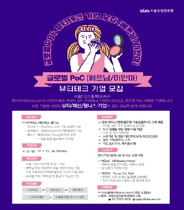 ¼¿ï»ê¾÷ÁøÈï¿ø(SBA, ´ëÇ¥ÀÌ»ç ±èÇö¿ì)°ú ¼¿ï½Ã´Â µ¿³²¾Æ ½ÃÀå¿¡ °ü½É ÀÖ´Â K-ºäƼÅ×Å© ±â¾÷À» À§ÇØ '¼¿ï ºäƼÅ×Å© ±Û·Î¹ú PoC Áö¿ø»ç¾÷' Âü°¡ ±â¾÷À» ¸ðÁýÇÑ´Ù.