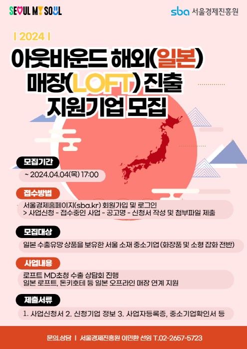 ¼¿ï½Ã Áß¼Ò±â¾÷ÀÇ ÇØ¿Ü ¸¶ÄÉÆÃ ¹× ¼öÃâ ÆÇ·Î È®´ë¸¦ Áö¿øÇÏ´Â ¼¿ï°æÁ¦ÁøÈï¿øÀº 4¿ù 4ÀÏ(¸ñ) ¿ÀÈÄ 5½Ã±îÁö Áß¼Ò±â¾÷ ÇØ¿Ü ÁøÃâ ÇÁ·Î±×·¥ÀÎ '2024³â ¾Æ¿ô¹Ù¿îµå ÇØ¿Ü(ÀϺ») ¸ÅÀå(LOFT) ÁøÃâ Áö¿ø »ç¾÷'ÀÇ Âü°¡±â¾÷À» ¸ðÁýÇÑ´Ù°í 29ÀÏ ¹àÇû´Ù.
