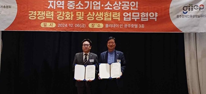 ±¤ÁÖ°æÁ¦ÁøÈï»ó»ýÀÏÀÚ¸®Àç´Ü(ÀÌÇÏ °æÁ¦ÀÏÀÚ¸®Àç´Ü)Àº Áö³ 6ÀÏ ±¤Áְ濵ÀÚÃÑÇùȸ(ÀÌÇÏ ±¤ÁÖ°æÃÑ)°¡ ÁÖÃÖÇÏ´Â 12¿ù ±Ý¿äÁ¶ÂùÆ÷·³¿¡¼ Áß¼Ò±â¾÷, ¼Ò»ó°øÀÎ º¸È£ ¹× °ø°ø¼ºñ½º È®»êÀ» À§ÇÑ »ó»ýÇù·Â ¾÷¹«Çù¾àÀ» ü°áÇß´Ù°í 8ÀÏ ¹àÇû´Ù. <»çÁø>