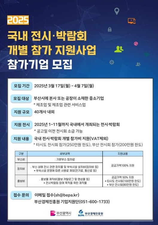 ºÎ»ê°æÁ¦ÁøÈï¿øÀº 17ÀϺÎÅÍ ´ÙÀ½´Þ 7ÀϱîÁö `2025³â ±¹³» Àü½Ã¡¤¹Ú¶÷ȸ °³º° Âü°¡ Áö¿ø»ç¾÷¡¯¿¡ Âü¿©ÇÒ ±â¾÷À» ¸ðÁýÇÑ´Ù°í 17ÀÏ ¹àÇû´Ù.