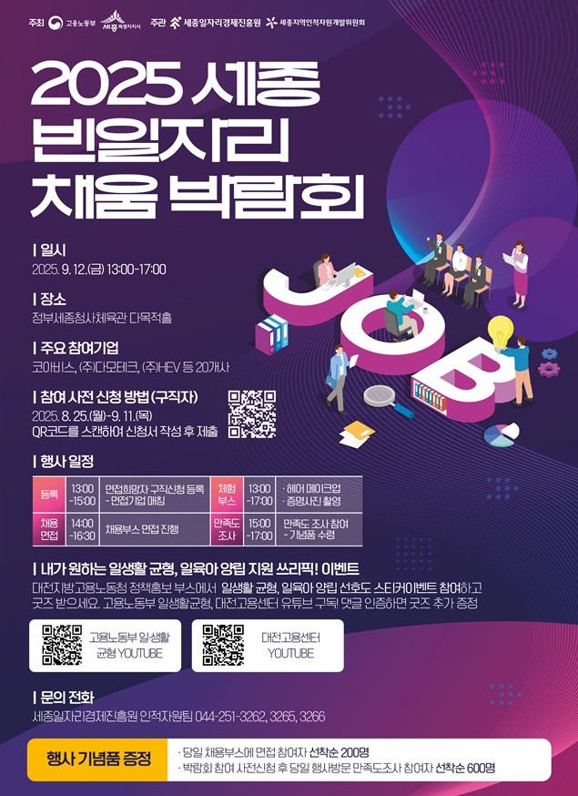 ¼¼Á¾ÀÏÀÚ¸®°æÁ¦ÁøÈï¿øÀº ¿À´Â 9¿ù 12ÀÏ ¡®2025³â ¼¼Á¾ ºóÀÏÀÚ¸® ä¿ò ¹Ú¶÷ȸ¡¯¸¦ °³ÃÖÇÑ´Ù. À̹ø ¹Ú¶÷ȸ´Â ¼¼Á¾½Ã »Ñ¸®»ê¾÷°ú Àü¹®°úÇбâ¼ú¾÷ ±â¾÷ÀÇ Àη³ ÇØ¼Ò¿Í Áö¿ª ±¸Á÷ÀÚÀÇ Ãë¾÷ ±âȸ È®´ë¸¦ À§ÇØ ¸¶·ÃµÆ´Ù.